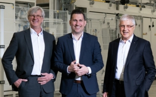Tobias Boeckh, Continental Industrie (links), und Thomas Weigert von Trützschler Nonwovens vor den Exhaustoren im Demozentrum Egelsbach. Die Komponentenpartnerschaft zwischen Trützschler Nonwovens und Continental Industrie besteht bereits seit über 25 Jahren. © Continental Industrie